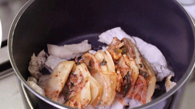 돼지고기 겉이 익었을 때 김치를 넣고 함께 볶아 주세요.