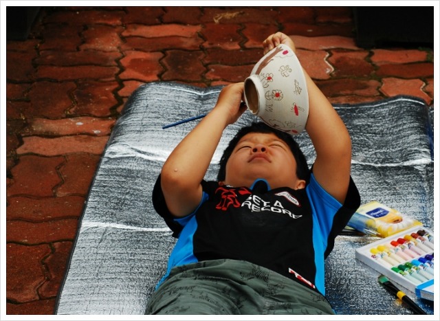 ▶토기는 왕의 무덤에 나왔잖아요. 왕의 입장이 되어 볼래요. 누워서 토기에 그림 그리기.