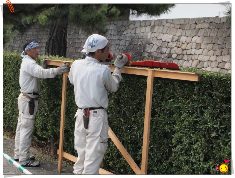 - 어라! 해병대 군인 머리처럼 직각으로 깍는 생울타리를 이렇게 만드는구나. 나무자를 대고 높이를 일정하게 깍는다.