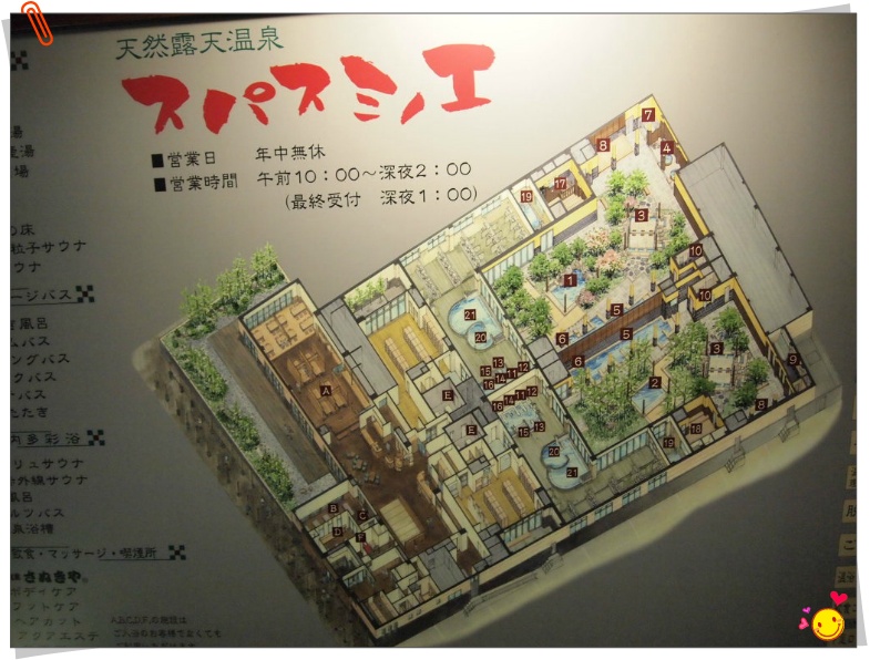 -스미노엔 온천 상세도이다. 연중 무휴 밤 늦게 까지 한다. 이제 제법 알려져서 한국 사람들도 많이 찾는 곳이다.(굴렁쇠)