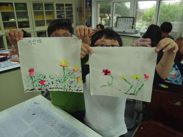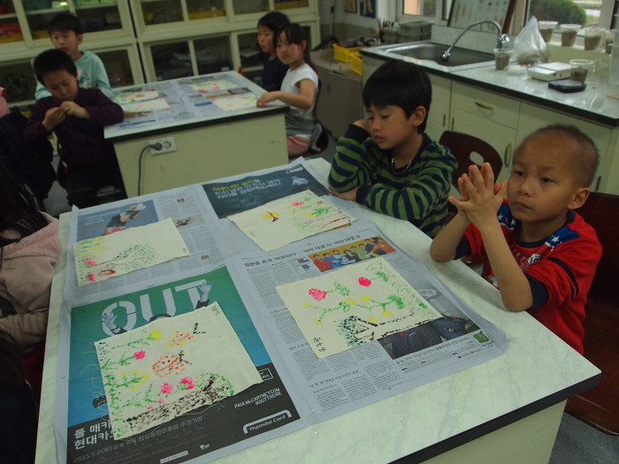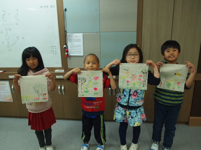 ▶자기가 그린 그림과 친구들이 그린 그림을 견줘보고, 자기가 좋아하는 꽃을 정하는 놀이도 했습니다.