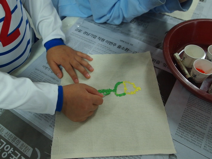 ▶광목천에다 면봉으로 아크릴 물감으로 그렸습니다. 면봉이 적다보니 정성을 들이지 않으면 잘 그려 지지 않지요.