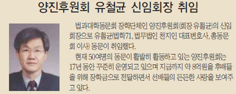 2010.12.7 리츠칼튼 호텔에서 개최된 제4차 양진후원회 정기모임에서 임기를 마치신 정재화 회장님 뒤를 이어, 유철균 변호사님께서 양진후원회 회장으로 선출되셨습니다. 아래는 유철균 회장님 인사말씀입니다.