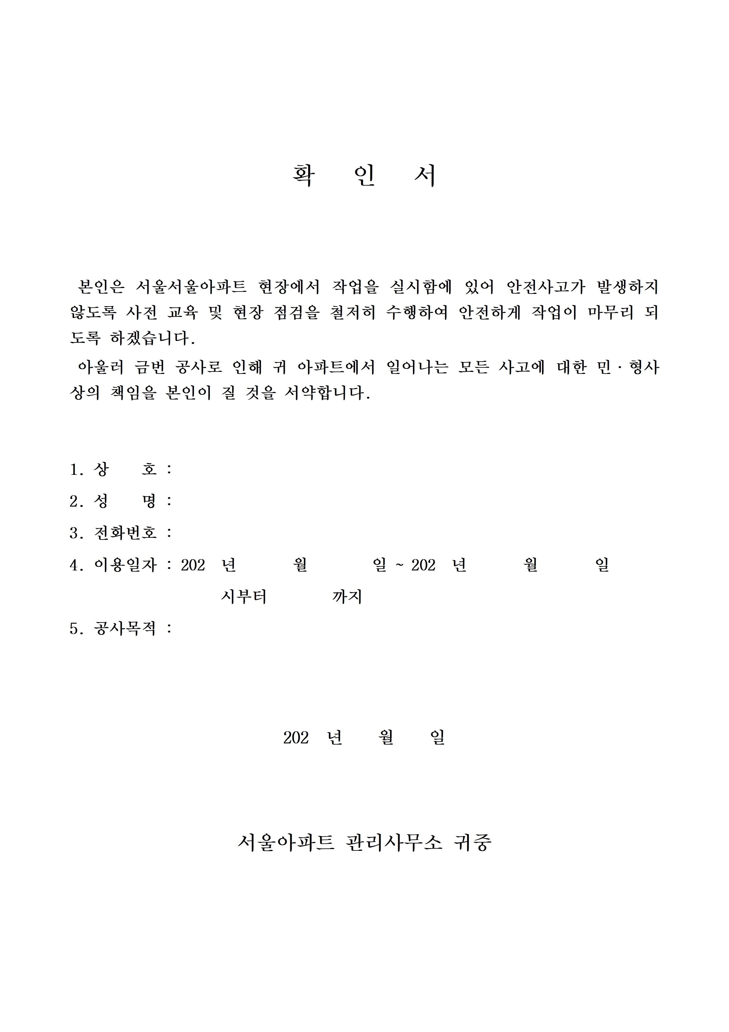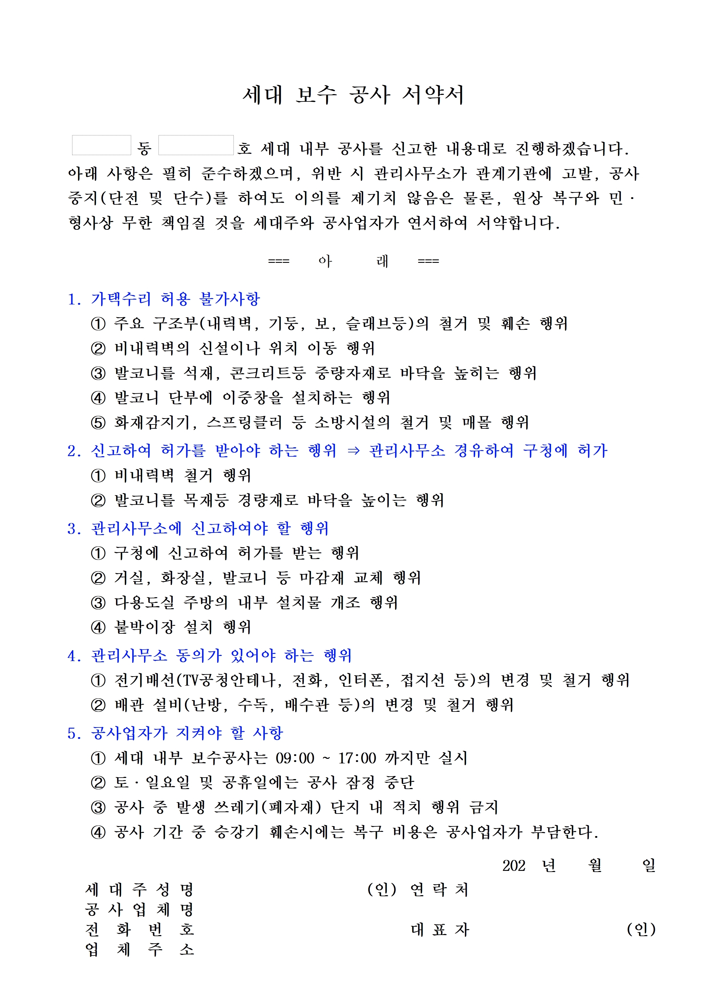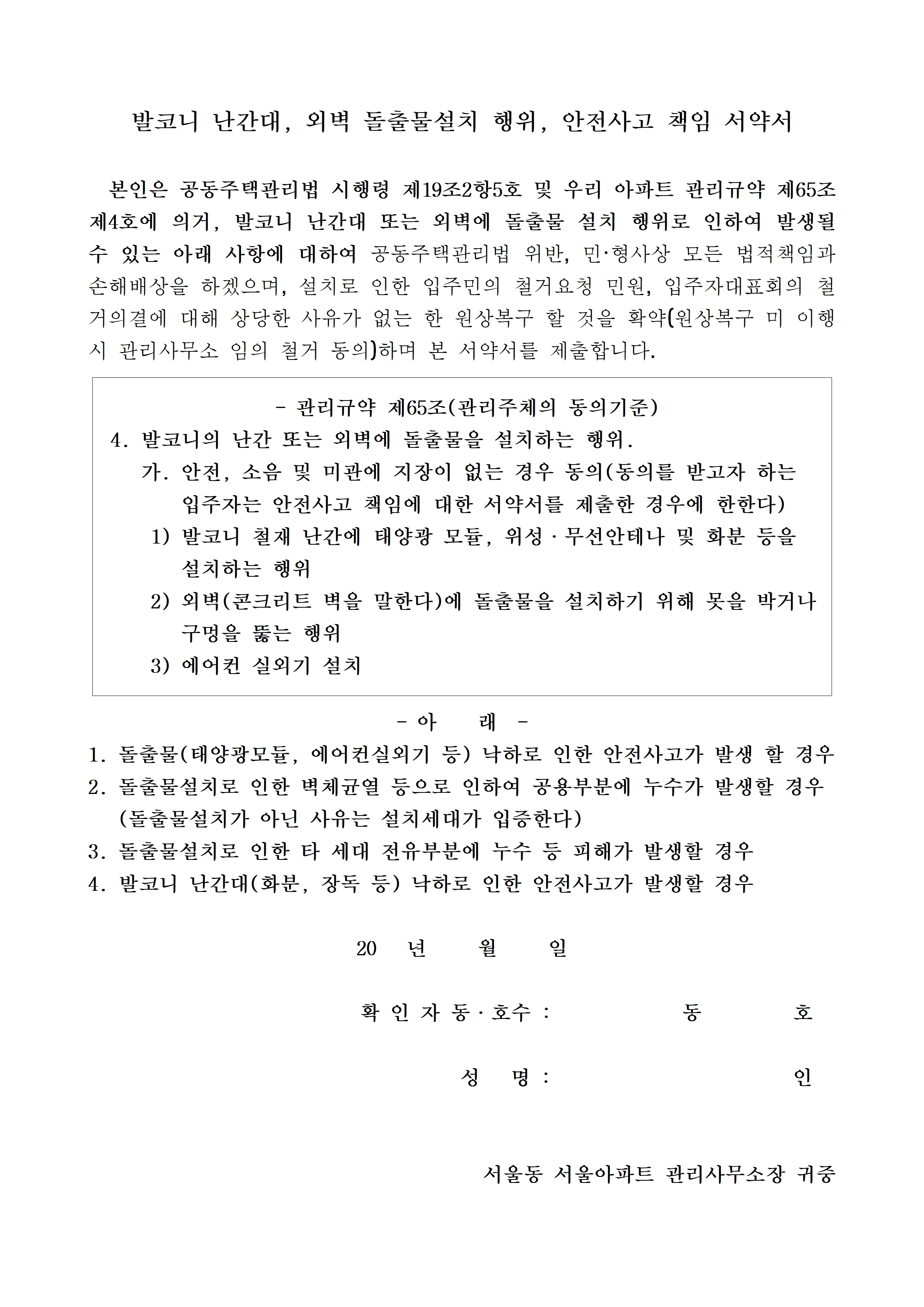 [스크랩] 공사서약서(동의서, 돌출물, 광고) 등(한글) 작성자아파트관리품질학교|작성시간26.01.03|조회수3 목록 댓글 0 글자크기 작게가 글자크기 크게가 제가 사용했던 일련의 세대공사 관련자료입니다공사서약서 등.hwp117.50KB 첨부파일첨부된 파일이 7개 있습니다. jpg 파일 공사서약서 등003.jpg 다운로드 jpg 파일 공사서약서 등002.jpg 다운로드 jpg 파일 공사서약서 등004.jpg 다운로드 jpg 파일 공사서약서 등005.jpg 다운로드 jpg 파일 공사서약서 등001.jpg 다운로드 jpg 파일 공사서약서 등006.jpg 다운로드 hwp 파일 공사서약서 등.hwp 다운로드 다음검색 스크랩 원문 : 같이가는 현재 게시글 추가 기능 열기 북마크 공유하기 신고 센터로 신고 댓글 댓글 0 댓글쓰기 답글쓰기 댓글 리스트