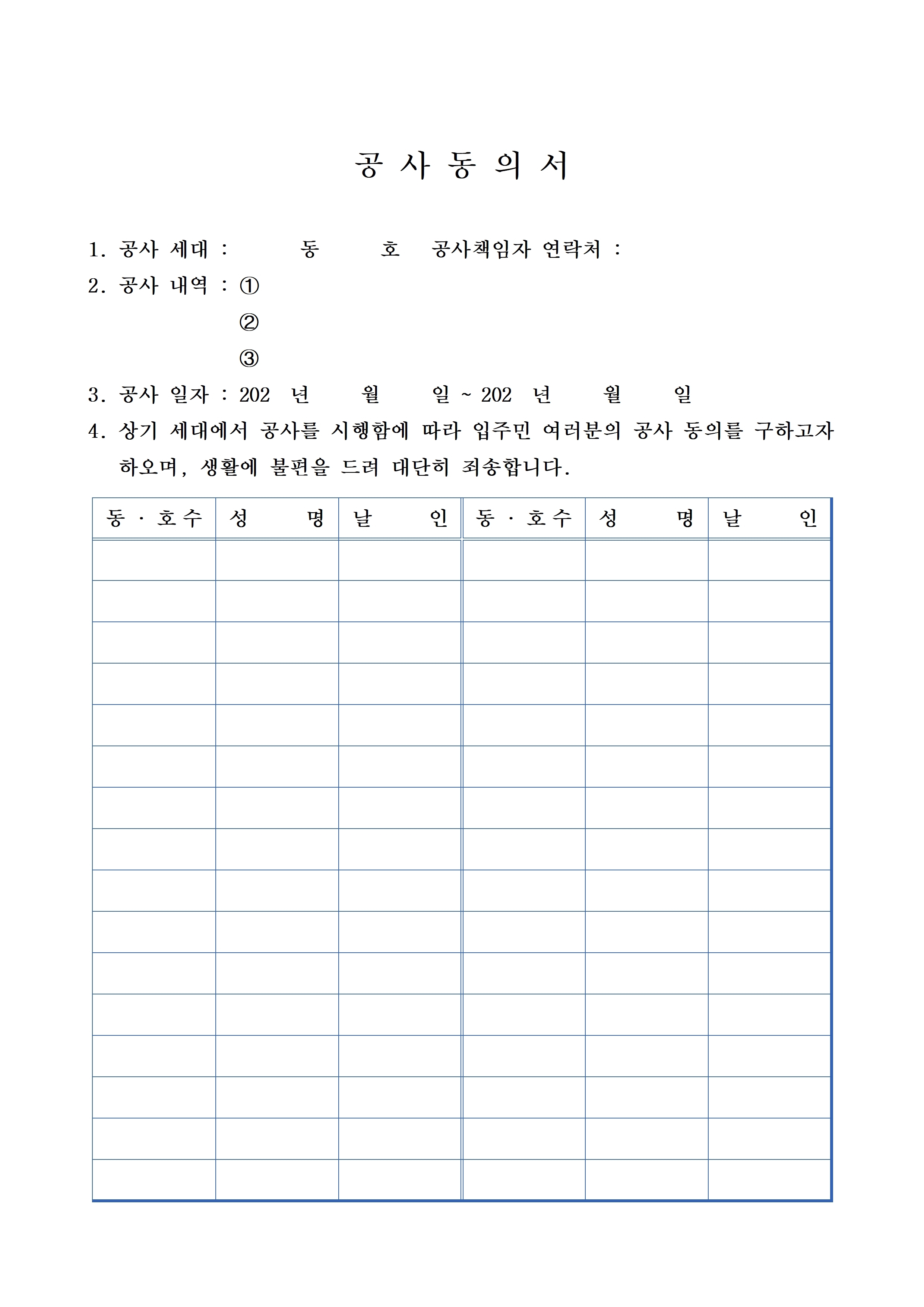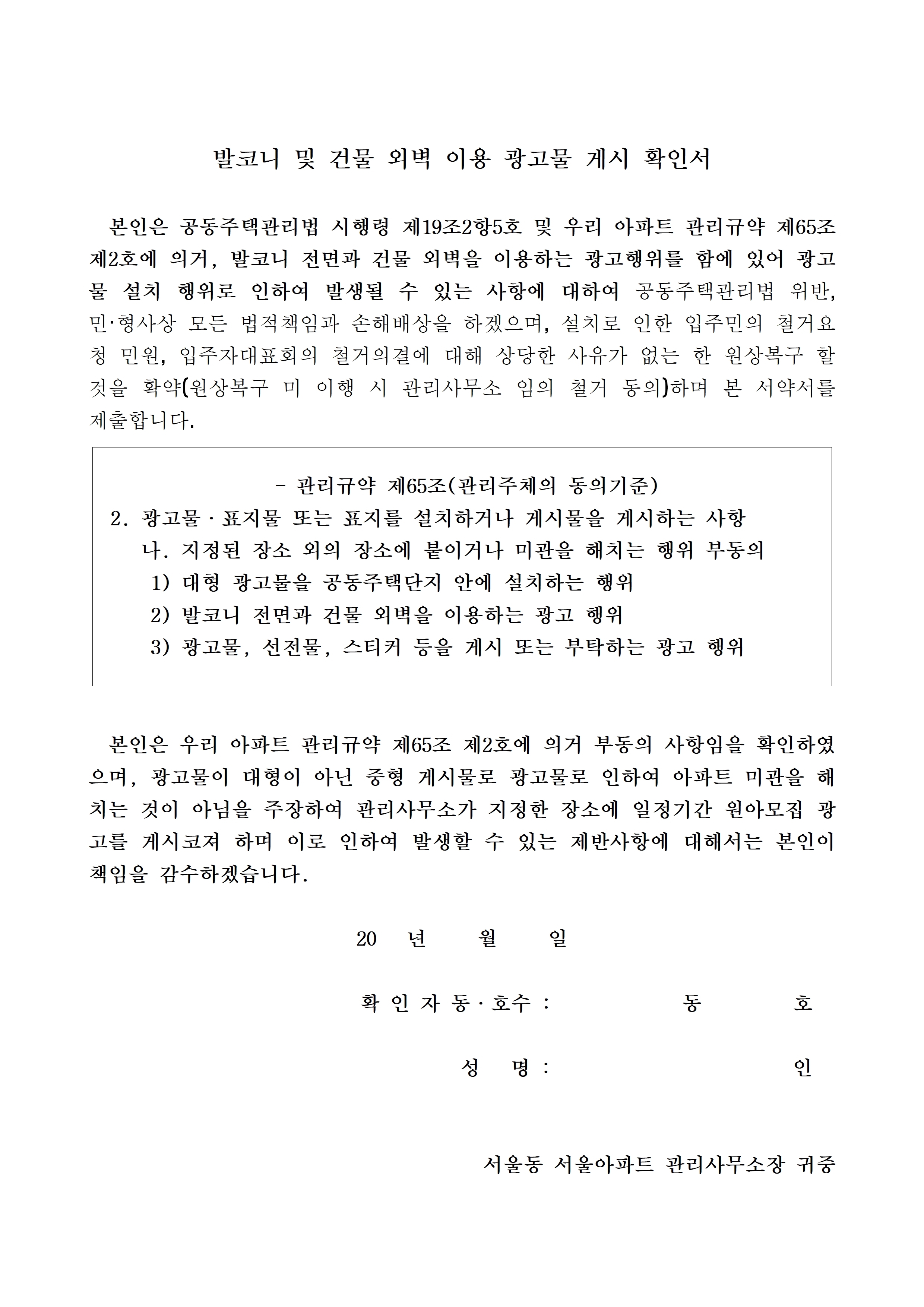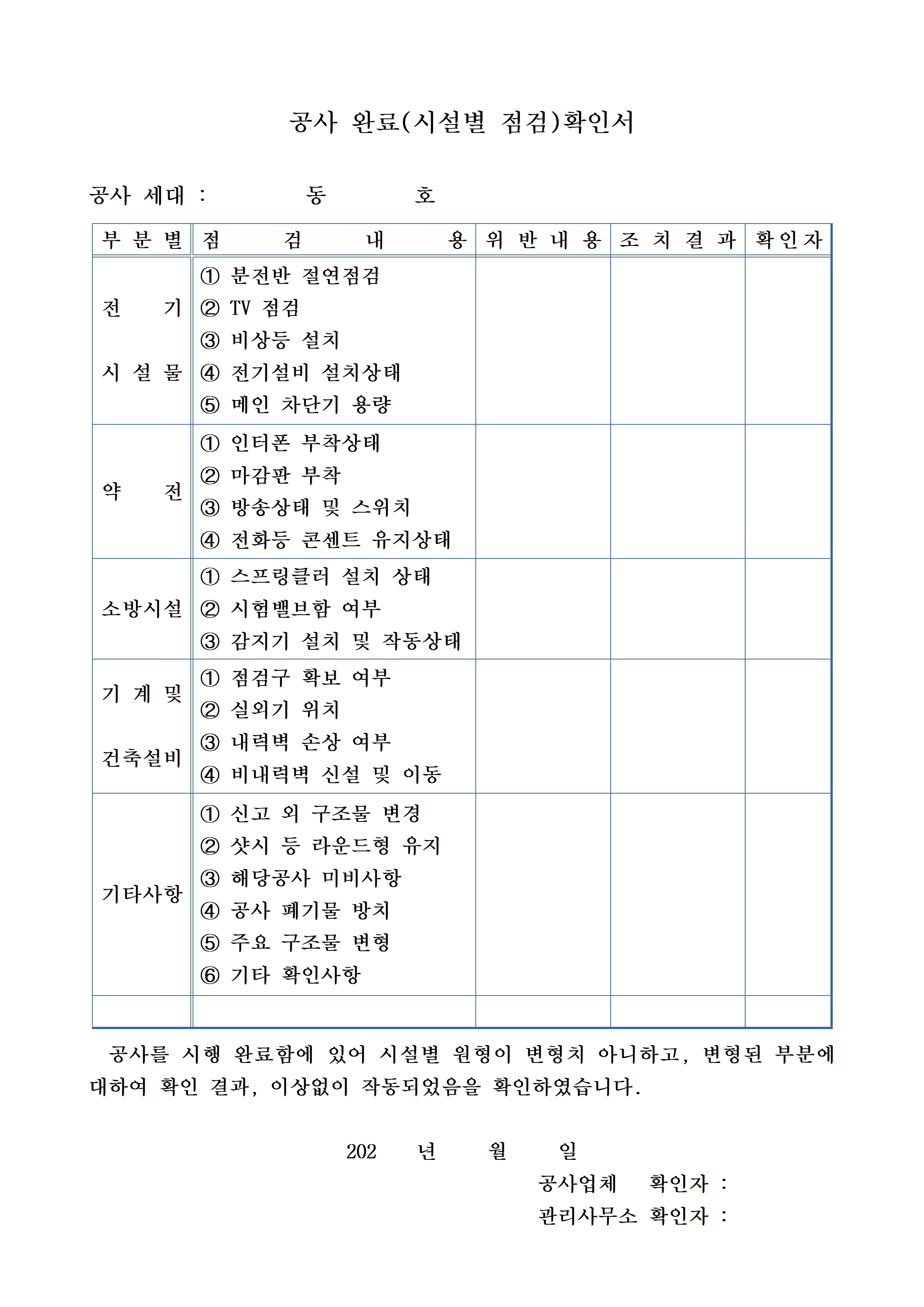 [스크랩] 공사서약서(동의서, 돌출물, 광고) 등(한글) 작성자아파트관리품질학교|작성시간26.01.03|조회수3 목록 댓글 0 글자크기 작게가 글자크기 크게가 제가 사용했던 일련의 세대공사 관련자료입니다공사서약서 등.hwp117.50KB 첨부파일첨부된 파일이 7개 있습니다. jpg 파일 공사서약서 등003.jpg 다운로드 jpg 파일 공사서약서 등002.jpg 다운로드 jpg 파일 공사서약서 등004.jpg 다운로드 jpg 파일 공사서약서 등005.jpg 다운로드 jpg 파일 공사서약서 등001.jpg 다운로드 jpg 파일 공사서약서 등006.jpg 다운로드 hwp 파일 공사서약서 등.hwp 다운로드 다음검색 스크랩 원문 : 같이가는 현재 게시글 추가 기능 열기 북마크 공유하기 신고 센터로 신고 댓글 댓글 0 댓글쓰기 답글쓰기 댓글 리스트