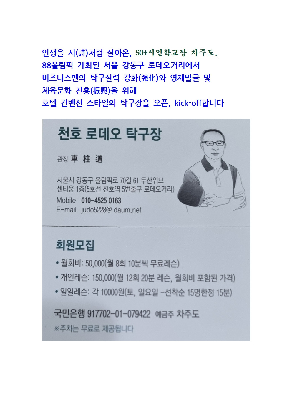 50+시인학교장 -최고의 호텔식 탁구장 오픝 작성자아파트관리품질학교|작성시간25.12.23|조회수8 목록 댓글 0 글자크기 작게가 글자크기 크게가 다음검색 현재 게시글 추가 기능 열기 북마크 공유하기 신고 센터로 신고 댓글 댓글 0 댓글쓰기 답글쓰기 댓글 리스트