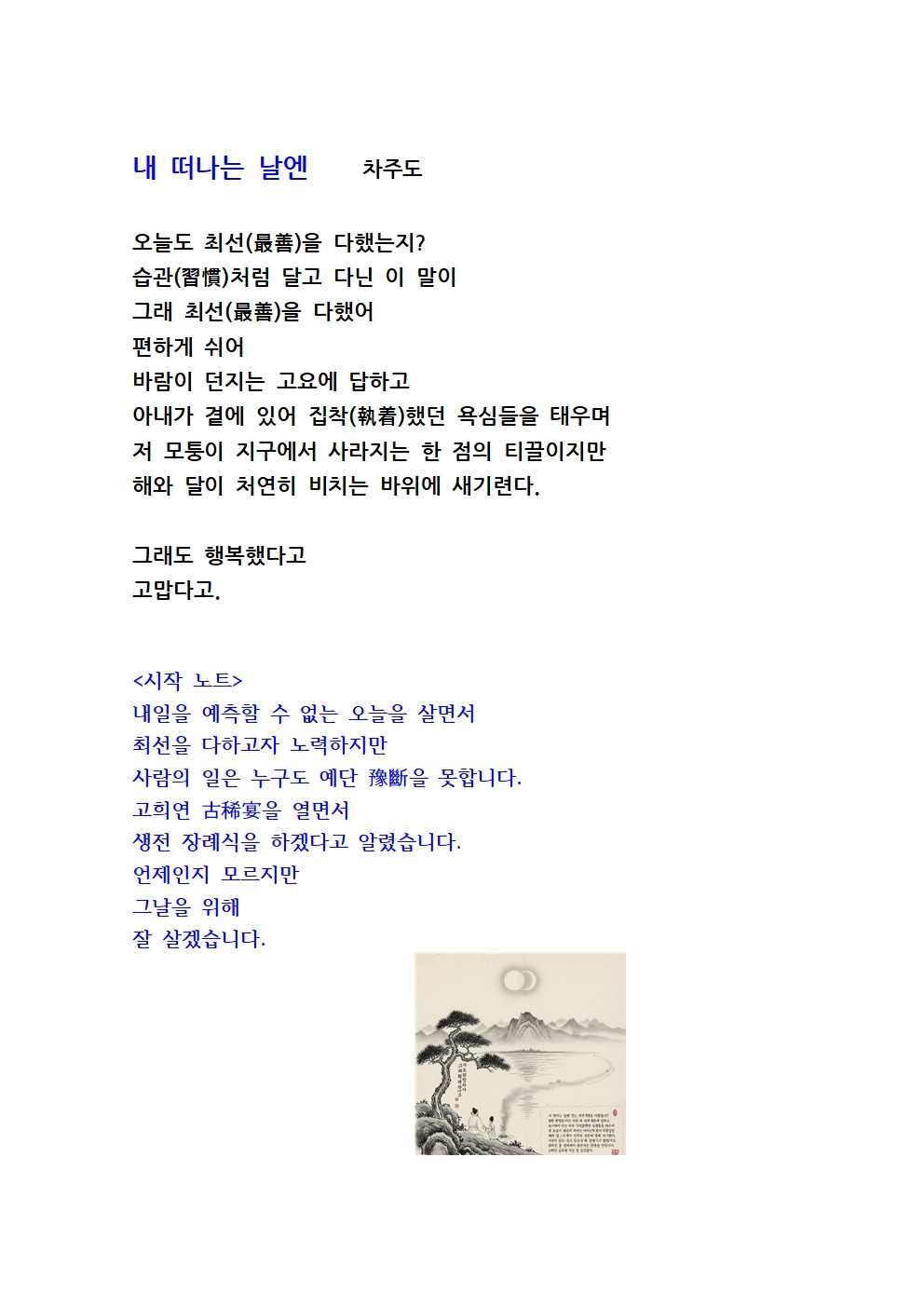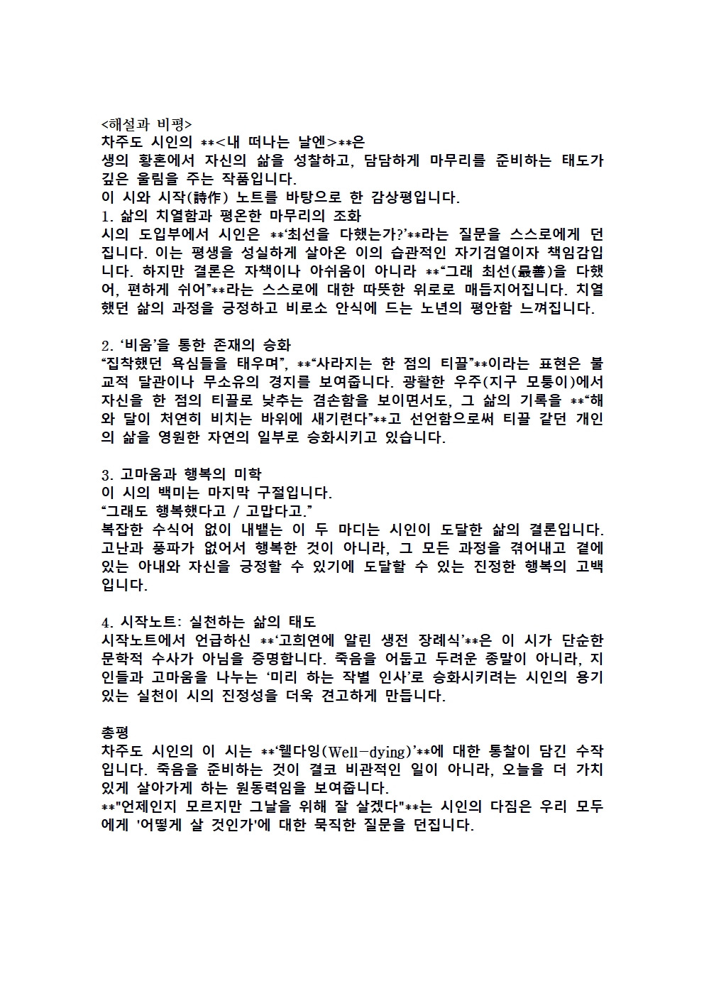 내 떠나는 날엔 - 시인 차주도 의 웰다잉 선언문 작성자아파트관리품질학교|작성시간25.12.24|조회수24 목록 댓글 1 글자크기 작게가 글자크기 크게가 https://cafe.daum.net/khma-1/OGmf/300내 떠나는 날엔 차주도.hwpx1.53MB 첨부파일첨부된 파일이 4개 있습니다. png 파일 image.png 다운로드 jpg 파일 내 떠나는 날엔 차주도001.jpg 다운로드 jpg 파일 내 떠나는 날엔 차주도002.jpg 다운로드 etc 파일 내 떠나는 날엔 차주도.hwpx 다운로드 다음검색 현재 게시글 추가 기능 열기 북마크 공유하기 신고 센터로 신고 댓글 댓글 1 댓글쓰기 답글쓰기 댓글 리스트 작성자아파트관리품질학교 작성자 본인 여부 작성자 | 작성시간 25.12.24 https://cafe.daum.net/khma-1/OGmf/300 댓글 전체보기