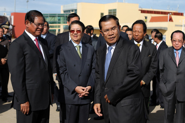 (사진: Vireak Mai / Phnom Penh Post) 캄보디아의 훈센(중앙) 총리가 어제(9.17) 아세안 회의 참석차 출국하기에 앞서, 고위 인사들의 출영을 받고 있다. 사진에서 그의 좌우측에 보이는 4명의 인사들은 모두 부총리이다. 좌로부터 사켕 내무부장관, 속안 관방부장관, 훈센 총리, 떼어 반 국방부장관, 호남홍 외무부장관. |