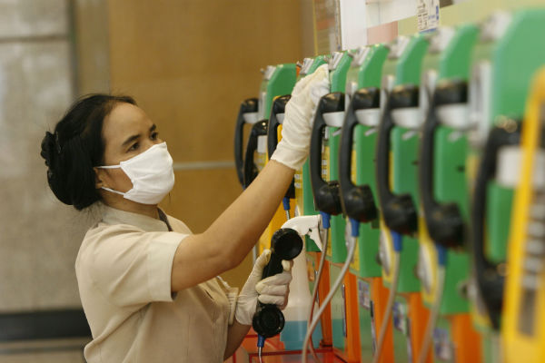 (자료사진: Apichart Jinakul / Bangkok Post) 방콕의 '마분크롱 쇼핑센터'(MBK shopping centre)에서 공중전화기들을 소독하고 있는 여성 청소 노동자의 모습. 2009년 촬영. |
