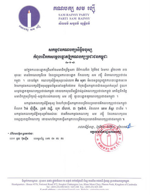 '삼랑시당'(SRP: 26석) 소속 국회의원 꾸오이 분로은(Kuoy Bunroeun)은 오늘 매우 상세하고 흥미로운 성명서를 발표했다(아래 첨부자료). 이 성명서는 [군소 제2야당인] '인권당'(HRP: 3석)의 껨 소카(Kem Sokha) 총재가 2012년 1월에 실시될 상원의원 선거(간접선거)를 앞두고, 껌뽕 짬(Kampong Cham) 도의 SRP 소속 지방의원들을 돈으로 회유하려 했음을 보여주고 있다.