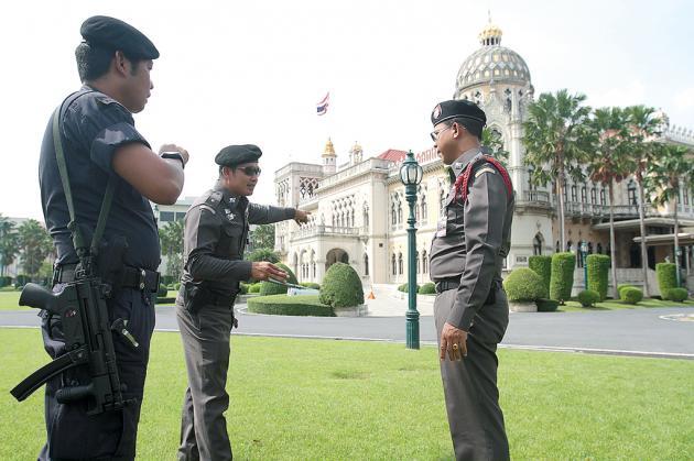 (사진) 태국 경찰 요원들이 버락 오바마 미국 대통령이 일요일(11.18)에 태국을 방문하는 것에 대비하여, 정부청사 앞에서 보안상황을 점검하고 있다. |