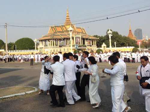 (사진: Sen David / Phnom Penh Post) 시하누크 전임 국왕의 장례식 행렬이 시가행진을 준비할 무렵, 도열해있던 속 안 부총리가 쓰러지자, 주변 사람들이 그를 들어서 후송하고 있다. |