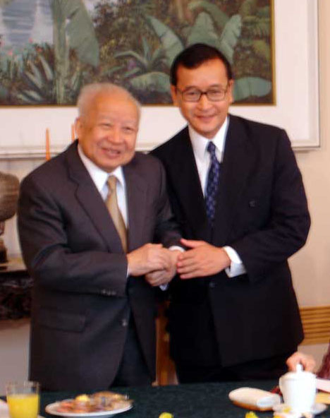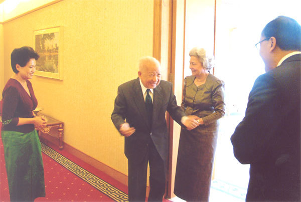 (자료사진) 시하누크 공의 생전에 삼 랑시 총재 부부를 접견하는 모습. 좌로부터 삼 랑시 총재의 부인이자 '삼랑시당'(SRP) 국회의원이기도 한 띠오울롱 사우무라(Tioulong Saumura) 의원, 노로돔 시하누크 전 국왕, 노로돔 모니니엇 왕대비, 삼 랑시 총재. |
