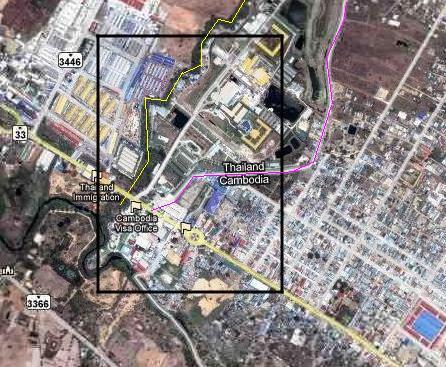 "크메르의 세계"는 이미 이전부터 이러한 문제를 파악하고 있었다. 이 지도는 구글맵의 뽀이뻿(포이펫, Poipet) 국경 부근이다. 실제의 국경선은 카지노구역을 표시한 검은박스 안쪽에서 노란 실선을 사용한 숲지대이다. 하지만 "구글맵"은 오른쪽의 분홍색 실선이 태국-캄보디아 국경선이라 하여, 카지노구역을 태국 영토로 표시했다. ☞ 상세지도 바로가기 |