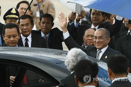 (사진: AP Photo / Heng Sinith) 노로돔 시하모니 캄보디아 국왕이 영접나온 여야 및 각계 귀빈들과 차례로 인사를 나눈 후, 훈센 총리(좌측 2번째) 및 헹 삼린 국회의장(국왕의 좌측)의 배웅을 받으며 전용차량에 오르고 있다.