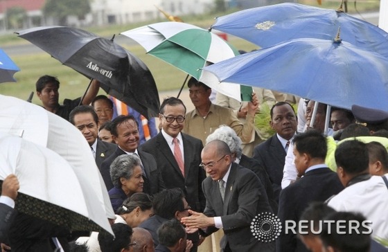(사진: Reuters) 노로돔 시하모니 캄보디아 국왕이 영접 대열의 가장 뒷부분에 도열해 있던 야당 지도부와 인사를 나누고 있다. 여당의 고위 관리들에게는 커다란 우산을 받쳐주는 경호원들이 1명씩 붙어 있었지만, 야당 인사들은 간간이 내리는 빗속에서도 우산을 사용하지 않아 이채로운 모습을 보였다.