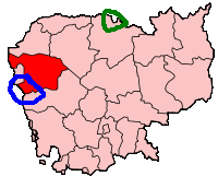(지도) 캄보디아 밧덤벙 도의 위치. 충돌이 발생한 삼로웃 군은 파란색 원으로 표시된 곳이다. 북쪽의 녹색 원으로 표시된 곳이 이달 초 대규모 교전이 발생했던 쁘레아위히어 사원이다. 두 지역의 거리는 300 km 정도이다.