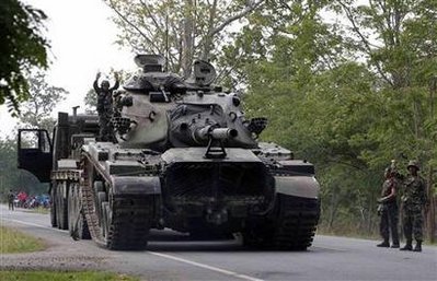 (사진: Reuters) 목요일(4.28) 교전 직후 태국 군이 전차를 증강배치하고 있다.