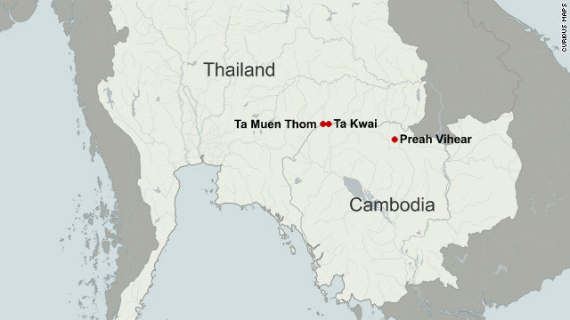 (지도) 태국-캄보디아 군대의 교전장소. 따모안톰 사원과 따끄라베이 사원은 지난 4월22일(금)부터 교전이 발생했고, 4월26일에는 쁘레아위히어 사원에서도 단발성 전투가 발생한 바 있다. 이 지도에 나타난 쁘레아위히어 사원은 그 위치가 잘못 되어 있다. 조금 더 북쪽의 국경선 상으로 옮겨져야만 한다. |