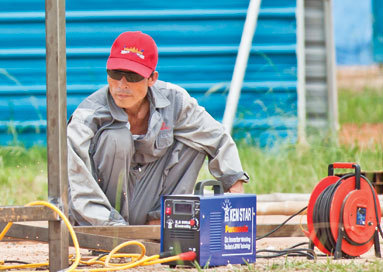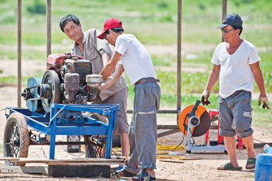 (사진: Don Weinland) 북한 기술자 2명(흰 셔츠)과 또다른 남성 1명이 시엠립 시내 인근에 위치한 미술관 부지에서 작업을 하고 있다.