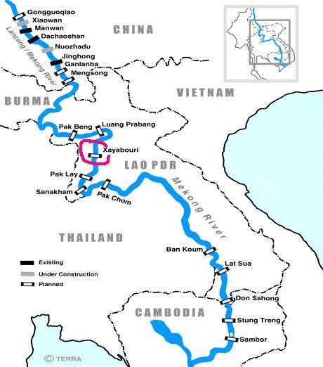 (지도출처: International Rivers) 메콩 강에 건설됐거나 계획 중인 댐들의 위치. 검은색 표시는 이미 완성된 댐들이고, 회색은 건설 중인 댐들, 그리고 양끝에 검은 점이 찍힌 흰색 표시들은 건설 예정지들이다. 지금까지는 상류 쪽의 중국 영내에서만 건설이 활발했다. 분홍색으로 표시된 곳이 샤야부리 댐 예정지이다. |