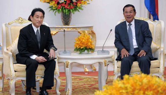 (사진: AFP) 키시다 후미오(좌측) 일본 외무상과 훈센(우측) 캄보디아 총리가 월요일(6.30) 환담을 나누고 있다. |