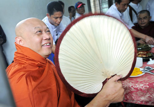 (자료사진: AFP) 영국 시민권자인 고위 승려 우 오따라 스님이 2014년 6월 27일 '땀웨 군 지방법원'에 출두한 모습. |