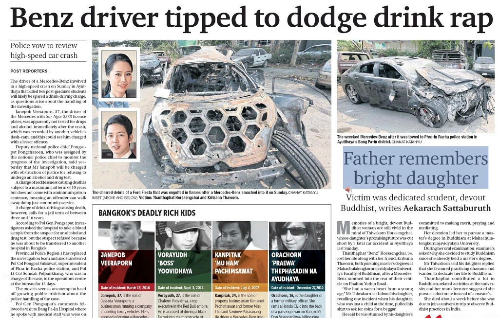 지난 3월13일 아유타야 도로변에서 발생한 메르세데스 벤츠와 포드피에스타의 충돌사고로 피에스타 승용차가 전소되어 타고있던 젊은 남녀가 사망하는 사고가 있었다. 사고원인은 벤츠의 과속으로 인한 충돌사고로 보도되었는데 벤츠 운전자는 심하게 다치지는 않았고 병원에서 혈액채취와 음주측정을 거부하여 음주운전여부가 의심이 되었는데 단순히 과속과 운전 부주의로 인한 사고로 끝나는듯 하다가 메스컴의 보도로 인하여 이 사고가 이전에 있었던 3건의 부유층 자녀들의 사고와 함께 태국내의 계층간의 사회정의 문제로까지 확대되는 듯한 분위기이다.