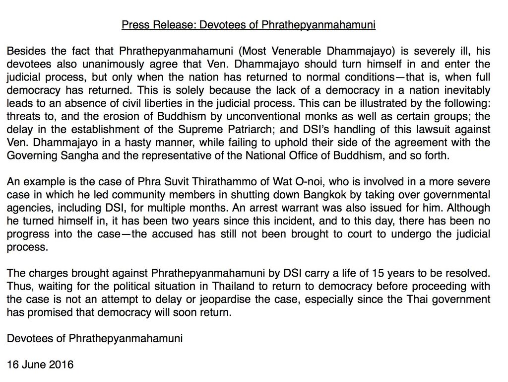 당국의 압박이 계속되자, 5월 말에 사원측과 프라 탐마차요 주지는 "자진출두"를 약속했지만, 당일이 되자 "중대한 건강악화"를 이유로 출두하지 않고, 대신 프라 탐마파요 스님이 병석에 누워 있는 사진과 동영상을 공개했었습니다.