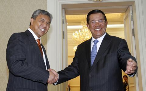 (사진: Reuters) 캄보디아를 방문한 아흐마드 자히드 말레이시아 국방부장관(좌)이 7월28일 관방부에서 훈센 총리(우)의 영접을 받고 있다. |