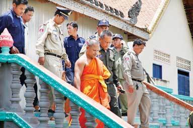 (사진: Heng Chivoan) '쯔레이 미어 사꼬' 파고다 주지였던 깡 사로은 스님이 경찰들에 둘러싸여 사찰을 나서고 있다.
