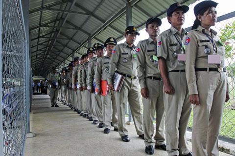 (사진: Reuters) 8월29일 프놈펜 외곽에 위치한 ECCC 청사에서 캄보디아 경찰관들이 재판의 진행에 참석하기 위해 줄지어 대기하고 있다. |