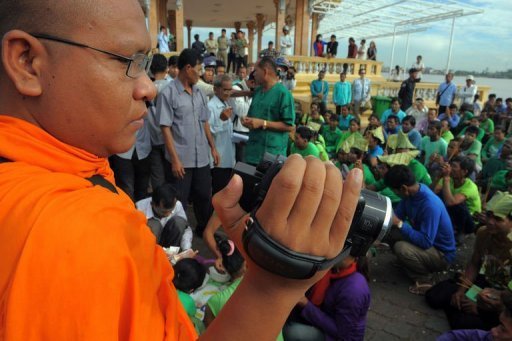(사진: AFP 파일/Tang Chhin Sothy) 루온 소왓 스님이 프놈펜의 왕궁 앞에서 진행된 집회에서 현장을 기록하고 있다. |