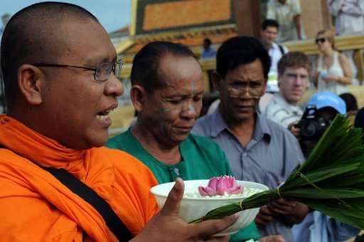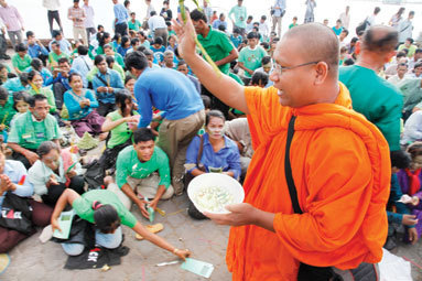 (사진: AFP 파일/Tang Chhin Sothy) 루온 소왓 스님이 프놈펜에서 진행된 집회에서 농성자들을 위한 종교의례를 갖고 있다. |