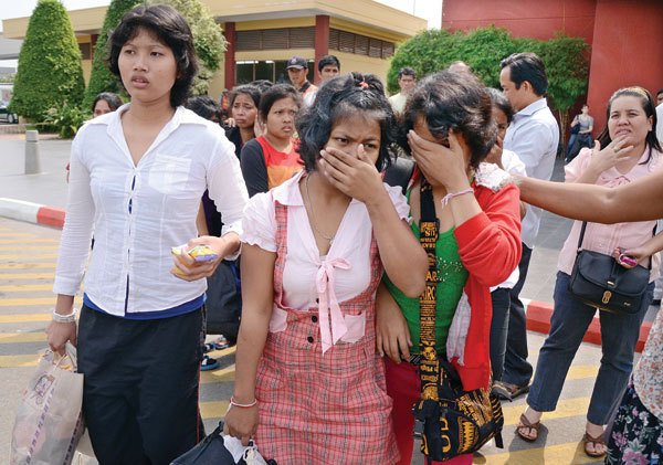 (사진: Pha Lina / Phnom Penh Post) 말레이시아에 가정부로 송출됐던 12명의 캄보디아 여성 노동자들이 금년 2월말 '프놈펜 국제공항'을 통해 귀국하고 있다. |