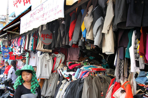 (사진: Vireak Mai / Phnom Penh Post) 12월25일 프놈펜 '러시안 마켓'의 옷가게 앞을 상인 한명이 지나가고 있다. 옷가게에는 긴팔 옷들이 진열되어 있다. |