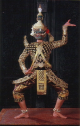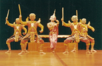 여성 무용은 "라카온 카올"(lakhaon khaol)로 불리는 남성 가면무용극을 보조적 형식으로 채택한다. 이 가면무용극은 <라마야나>의 캄보디아 판인 <리엄꺼>(Raemker)를 소재로 한 것으로 초기 앙코르 시대부터 시작되었다. 본질적으로 권선징악을 주제로 다룬 <리엄꺼>는 위쉬누(Vishnu) 신의 화신인 라마(Rama) 왕자의 모험을 다루고 있다. 이 이야기에서, 라마가 태어나기 전에 신들은 그를 영웅으로 만들기로 결정한다. 하지만 다양한 시험과 모험을 통과해야만 하도록 했다. 라마 왕자는 왕좌를 포기하고, 아름다운 아내 시따(Sita)와 동생인 락슈만(Lahksman)과 함께 여러 해 동안 황야를 떠돌게 된다. 악마의 왕 라와나(Ravana)가 시따를 납치하지만, 라마 왕자는 원숭이들의 왕이자 바람의 신의 아들인 하누만(Hanuman)의 도움으로 마침내 그녀를 찾아내고 만다.