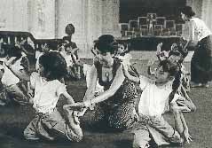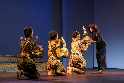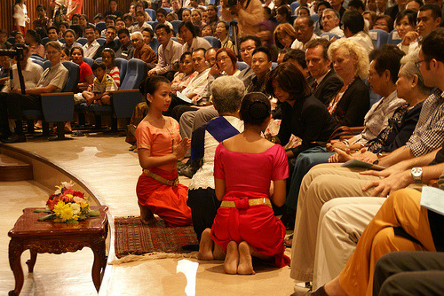 | 심지어는 격투기들을 포함하여 크메르 전통 예술과 문화에서 차지하는 스승의 위상은 지대하다. 공연이 끝난 크메르 고전무용 출연자들이 안무가인 노로돔 보파 데위 공주에게, 스승께 감사를 표하는 "삐티 솜피어 끄루"(Pithi Sompeah Kru, ពិធីសំពះគ្រូ) 의식을 거행하고 있다(상/하). [사진촬영] Sovannahong 2008-7-5. |