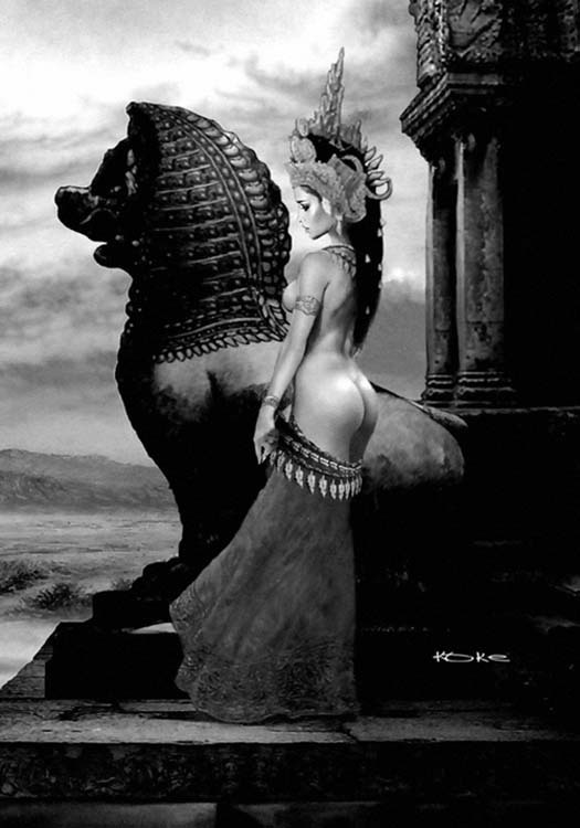 하단의 그림은 압사라 여신 등 전통적인 크메르민족의 상징들을 이용해 세미누드 작품들을 그려내 논쟁을 야기한 리어후(Reahu)라는 닉네임의 화가가 그린 그림이다. 원래는 칼라로 된 작품이지만, 여기서는 흑백으로 변환해 가공되었다.