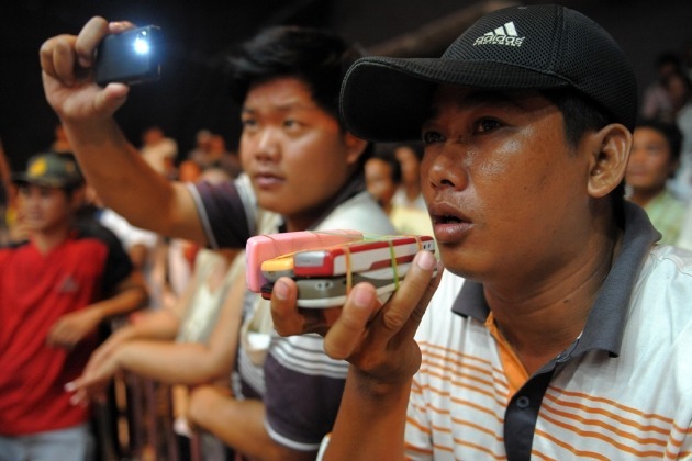 (자료사진) 프놈펜에 위치한 쁘러달 세레이 경기장에서, 한 갬블러가 여러 대의 휴대폰을 이용해서 시합을 중계하고 있다. [촬영: 2010-5-15. Tang Chhin Sothy/AFP/Getty Images] |