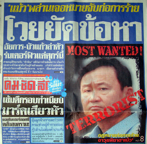 (자료사진) 태국어 일간지 중 발행부수 면에서 4위의 위상을 가졌지만, 가장 보수적인 매체 중하나인 <콤찻륵>(Kom Chad Luek, คมชัดลึก)의 1면 모습. <콤찻륵>은 영자지 <더 네이션>(The Nation)과 더불어 '네이션 멀티미디어 그룹'(Nation Multimedia Group)의 자회사인데, 이 사진을 통해서도 <콤찻륵>이 얼마나 노골적인 반-탁신 성향의 언론인지를 잘 알 수 있다. <콤찻륵>은 비록 발행부수가 50만~80만부 정도로 추정되지만, 태국의 중상류층들이 주 구독층이다. 위의 사진은 레드셔츠 시위가 끝난 직후인 2010년 5월 27일에 발행된 신문의 1면이다. 탁신의 사진에 "최고 지명수배" 및 "테러리스트"라는 용어가 사용되어 있다. [크세] |