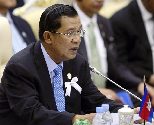 (사진: AP Photo / Heng Sinith) 캄보디아의 훈센 총리가 11월20일 프놈펜의 '평화의 궁전'(=총리 관저)에서 열린 '동아시아 정상회의'(EAS)에서 발언을 하고 있다. 그의 가슴에는 서거한 시하누크 전임 국왕을 기리는 흰색 리본이 달려 있다. 훈센 총리는 폐막 기자회견에서 "시하누크 상왕께서 우리나라가 이런 큰 행사를 주최하는 모습을 못보시고 돌아가셔서 슬프다"며 눈물을 보이고, "피곤하다"면서 질문을 받지 않았다. |