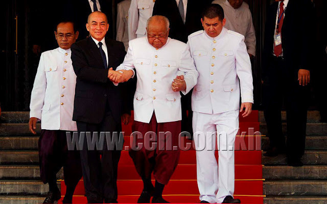 (사진: CEN) 3월24일 제3기 캄보디아 상원의회 개원식에서, 노로돔 시하모니(좌측 2번째) 국왕이 찌어 심(중앙) 상원의장을 부축하며 입장하고 있다. 우측의 인물은 상원의장 경호실장인 유임 리엉 중장으로서, 유임 처일 리 부총리의 아들이다. |