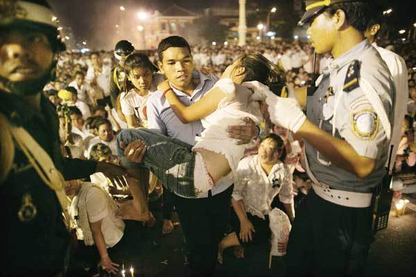 (사진: Alexander Crook / Phnom Penh post) 노로돔 시하누크 전임 국왕의 추모주간 마지막 날인 10월23일, 한 청년이 왕궁 앞의 추모 인파 속에서 탈진한 여성을 후송하고 있다. |