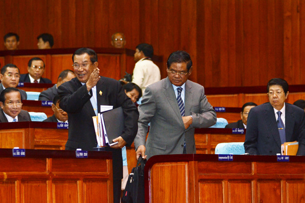 (사진: Pha Lina / Phnom Penh Post) 훈센 총리가 8월9일 프놈펜의 국회의사당에서 연단에 오르기 직전 특유의 익살스런 몸짓을 보이고 있다. 총리의 연설이 있었던 국회에는 캄보디아의 주요 각료들이 전원 참석했다. 사진에서 훈센 총리의 우측으로 사켕(Sar Kheng: 서있는 이) 부총리 겸 내무부 장관과 속안(Sok An: 우측 끝) 부총리 겸 관방부장관이 보이고 있다. |
