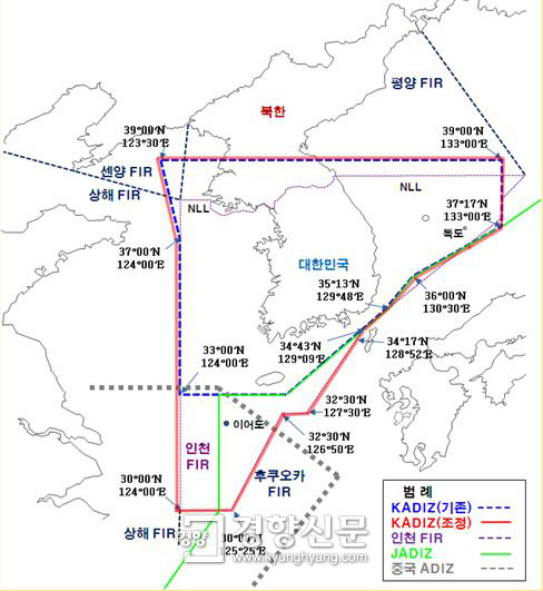 국방부는 김민석 대변인은 이날 브리핑을 열고 “새로운 방공식별구역은 기존 KADIZ의 남쪽 구역을 국제적으로 통용되고 인접국과 중첩되지 않은 ‘인천 비행정보구역(FIR)’과 일치되도록 조정됐다”며 “이 조정된 구역에는 우리 영토인 마라도와 홍도 남방의 영공, 그리고 이어도 수역 상공이 포함됐다”고 발표했다. 이어 “새로운 KADIZ는 관보와 항공 고시보를 통한 고시 절차와 전파에 걸리는 시간을 고려해 7일간의 준비기간을 둬 오는 15일 효력이 발생하도록 고시할 것”이라고 설명했다.