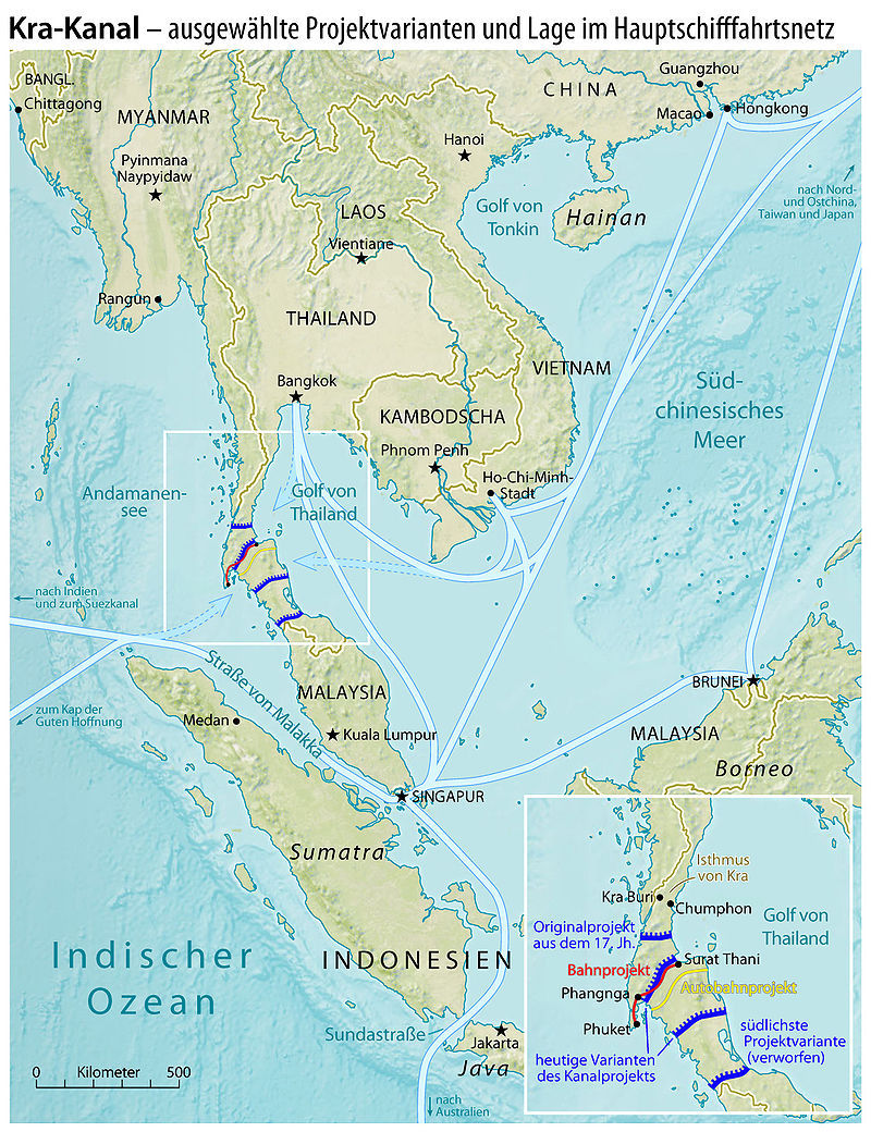 끄라 지협에 건설할 운하를 '태국 운하'(Thai Canal)라고 부르는데, 이 지역에 운하를 뚫는다는 구상은 1677년부터 존재했다. 아유타야 왕국의 나라이(Narai)국왕은 프랑스인 엔지니어를 파견하여 타당성 조사를 했었지만, 당시의 기술로는 무리가 있는 것으로 판단됐다. 이어진 짜끄리 왕조(=현재의 태국 왕실) 시대 및 근년에 이르기까지 태국 운하 건설계획은 지속적으로 논의돼 왔지만 현실화되지 못한 상태였다. 이하의 지도는 '위키피디아 영문판'의 자료로서, 그 동안 모색됐던 '끄라 운하'(=태국 운하)의 노선들이다.