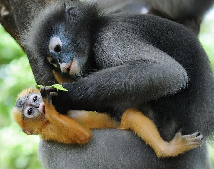(사진) 검은잎원숭이의 젖먹이 아기는 어미와 전혀 달리 황금색 털을 갖고 있다. 실물은 황금색과 주황색의 중간 정도 밝기를 지녔다.