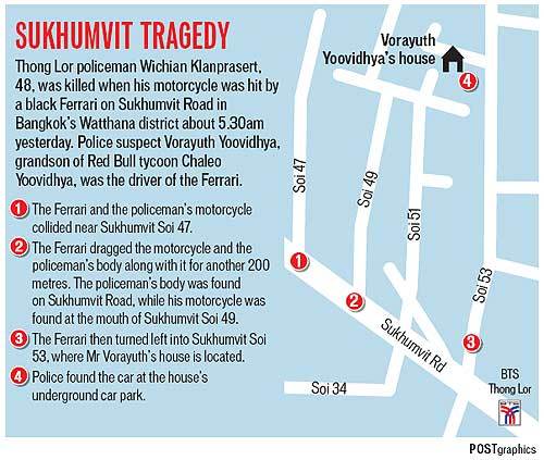목격자들이 경찰에 증언한 바에 따르면, 검은색 페라리 스포츠카는 오토바이를 들이받은 후, 속도를 높여 달아났고, 이후 '수쿰윗 써이 하십쌈'(Sukhumvit Soi 53: 수쿰빗 53번지)에 위치한 한 주택의 지하 주차장으로 들어갔다. 이 주택은 '레드 불' 가문의 소유이다.