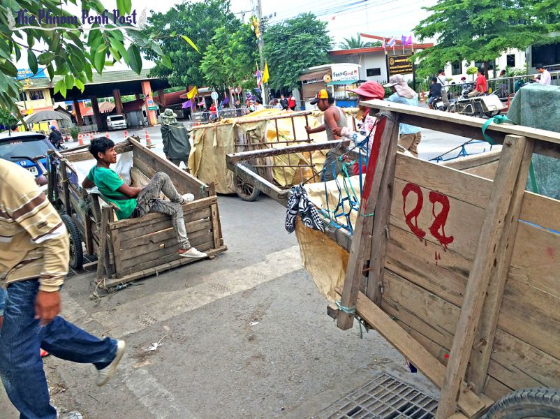 (사진: Khouth Sophak Chakrya / The Phnom Penh Post) 금요일(5.29) 뽀이뻿 시의 캄보디아-태국 국경에서, 포터들이 물자 수송용 손수레들을 끌고 순서를 기다리고 있다.